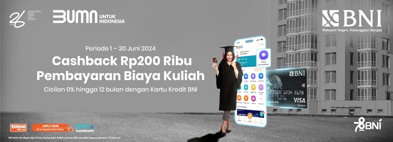 - Cashback Rp 200 ribu dengan minimum transaksi Rp 8 juta untuk setiap transaksi pembayaran biaya pendidikan menggunakan Kartu Kredit BNI di Mobile Banking BNI.