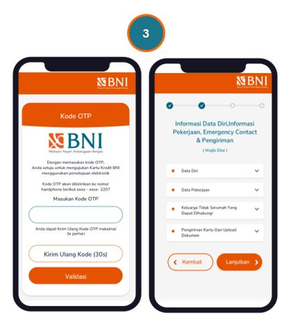 Masukan 5 digit kode OTP yang dikirimkan melalui SMS (validasi) dan lanjutkan pengisian pada data diri, data pekerjaan, emergency Contact, upload dokumen dan pengiriman kartu.