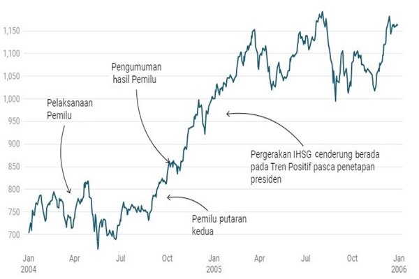 Pada Pemilu 2004, IHSG mengalami pelemahan saat pelaksanaan putaran pertama. Kemudian saat pelaksanaan putaran kedua dan berlanjut saat pengumuman hasil Pemilu, hingga penetapan presiden dan wakil presiden terpilih, IHSG berhasil mengalami kenaikan dengan persentase sebesar 17.7%. Kala itu, faktor kekhawatiran terhadap pelaksanaan Pemilu menjadi salah satu sentimen negatif terhadap perekonomian Indonesia.