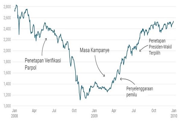 Meskipun pada 2008 dunia dilanda krisis ekonomi dan Indonesia sempat terkena efeknya, akan tetapi hal tersebut tidak berlangsung lama. Memasuki 2009 ekonomi Indonesia mulai bangkit, hal ini tergambar dari kondisi IHSG yang mengalami kenaikan sejak saat masa kampanye Pemilu di awal 2009, kemudian berlanjut ke penyelenggaraan Pemilu, hingga penetapan presiden dan wakil presiden terpilih. Kala itu IHSG berhasil mencatat kenaikan luar biasa dengan persentase kenaikan sebesar 53,7%.