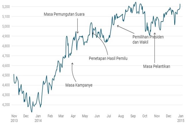 Pemilu 2014 juga berdampak positif terhadap kinerja IHSG saat itu. Persaingan dan adu program kerja antara pasangan Prabowo-Hatta dan Jokowi-Jusuf Kalla berdampak positif terhadap kenaikan IHSG dengan persentase kenaikan sebesar 17,6%. Meskipun saat penetapan hasil Pemilu IHSG sempat mengalami sedikit penurunan, tetapi hal itu tidak terlalu berdampak.