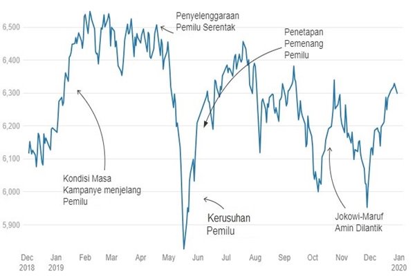 Persaingan politik antara pasangan Jokowi-Ma'ruf dan Prabowo-Sandi pada Pemilu 2019 berlangsung panas. Hal tersebut juga memengaruhi IHSG yang ikut memanas dan bergerak naik di awal masa kampanye dari Februari hingga April 2019. Namun, pada bulan Mei 2019 IHSG mengalami penurunan yang cukup drastis efek dari pengumuman hasil pemenang yang menyisakan polemik. Pergerakan IHSG kembali naik saat ditetapkannya pemenang Pemilu 2019 yaitu pasangan Jokowi-Ma'ruf. Tercatat saat itu IHSG hanya mengalami kenaikan sebesar 4,6%.