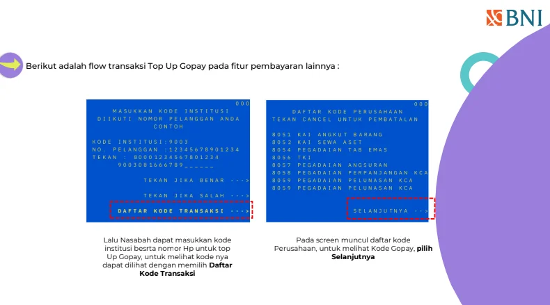 Oleh karena itu, saat ini Nasabah dapat dengan mudah melakukan Top Up Gopay (baik untuk customer/driver/merchant) dengan memilih Menu “PEMBAYARAN LAINNYA” dan memasukan kode transaksi 9003 dilanjutkan dengan Nomor Gopay di BNI ATM/CRM.