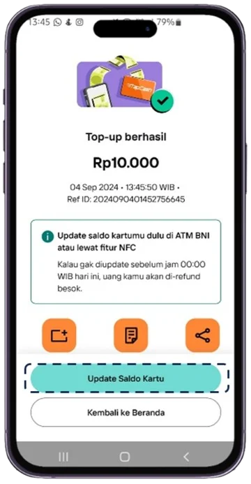 Top up berhasil akan muncul menu seperti terlampir, lalu klik “Update Saldo Kartu” untuk sinkronisasi saldo ke fisik kartu TapCash.